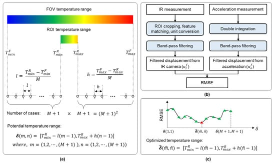 Step 2: The displacement was first estimated from the IR measurement using the first temperature range and the estimated scale factor and then bandpass-filtered to obtain the filtered IR-based displacement (). The filtered displacement was estimated from the acceleration measurements using double integration and bandpass filtering. Subsequently, the RMSE between the filtered acceleration and IR-based displacements was calculated (Figure 4b).