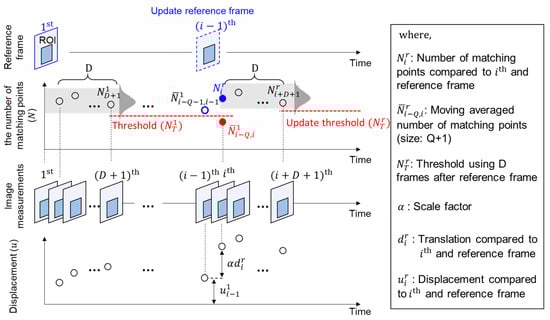 Figure 8 shows an example of the threshold updating process. The threshold value () was initially determined using frames after the first frame. In the ith frame, the moving-averaged feature-matching number () is less than . Therefore, the reference frame is updated to the frame and the threshold is updated () using frames after the frame.