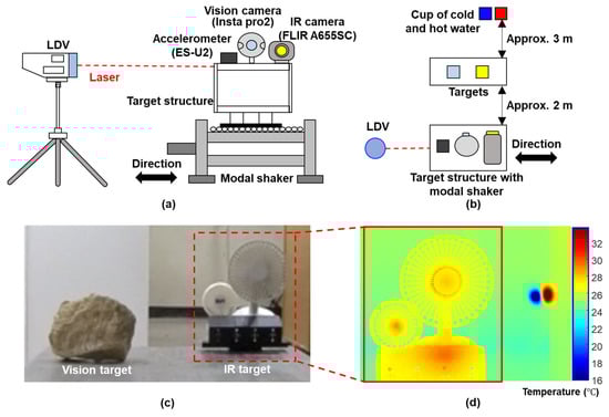 Overview of lab-scale test on a single-story building model: (a) front view of experiment setup, (b) top view of the experiment setup, (c) targets for vision and IR cameras, and (d) cropped IR image.