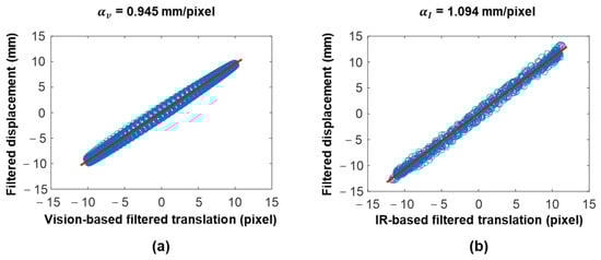 The scale factors for vision and IR measurements were estimated using the algorithm proposed in Section 2.1.1, exciting the building model with a 1 Hz sinusoidal signal. A bandpass filter was used before estimating the ratio between the acceleration-based displacement and the camera-based translation. The lower and upper cutoff frequencies of the bandpass filter were set to 0.3 Hz and 3 Hz, respectively, considering the effective frequency range of the accelerometer and the sampling rate of vision and IR cameras []. Figure 10 shows the estimated scale factors () for the vision and IR cameras, which are 0.945 mm/pixel and 1.094 mm/pixel, respectively.