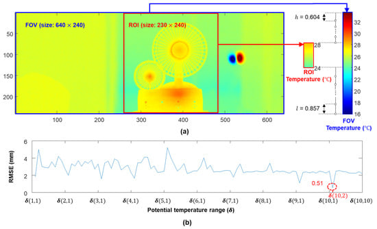 Next, the temperature range was optimized for the IR measurements. Figure 11a shows the FOV of the IR camera and cropped ROI. The maximum and minimum temperatures were 33.52 and 15.94, respectively, for the FOV due to the existence of two cups of water, while they were 28.08 and 23.65 , respectively, for the ROI. The differences between the maximum and minimum temperatures of FOV and ROI were equally divided into nine parts, and the values of and were set to 0.857 and 0.604, respectively, as shown in a in Figure 11a. Potential temperature ranges were generated for different combinations of and , and the corresponding RMSEs were calculated, as shown in Figure 11b. Finally, the temperature range [16.79, 28.08 ] corresponding to the smallest RMSE was selected as the optimized temperature range.