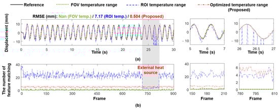 Figure 13a compares the ROI images and corresponding matching results at the 340th frame without an external heat source (i.e., the finger). Only one feature point was matched when the FOV temperature range was used, because of the relatively small temperature variations within the ROI. Although a relatively large number of feature points (27) matched when the ROI temperature range was used, many were mismatched. Therefore, the displacement estimation accuracy was low in both cases. Figure 13b compares the ROI images and corresponding matching results at the 768th frame with the external heat source (i.e., the finger). No feature point was matched when the FOV temperature range was used, which caused failure in the continuous displacement estimation. The external heat source significantly reduced the number of matched feature points, and decreased the displacement estimation accuracy when using the ROI temperature range. However, the external heat source had less effect on the number of matched feature points when using the optimized temperature range, and four sufficient feature points were stably matched in both the 340th and 768th frames.