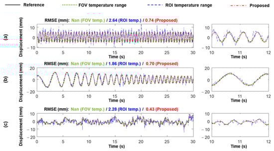 The superiority of using the optimized temperature range was further validated under three additional excitation signals, that is, a 2 Hz sinusoidal signal, 0–3 Hz sweep signal, and a recorded real bridge vibration signal. The displacements estimated using the different temperature ranges are compared in Figure 14. Using the optimized temperature range reduced the average RMSEs by 72.57% compared to using the ROI temperature range, and displacements were estimated accurately with RMSEs below 0.8 mm. Note that displacements were not continuously estimated using the FOV temperature range. Therefore, the RMSEs could not be calculated.