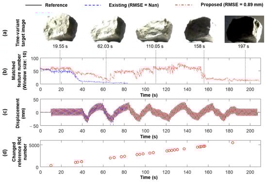 Figure 16a compares the captured target images at different times, and illumination variation is clearly observed. Figure 16b,c compare the number of matched feature points and estimated displacements using the existing and proposed techniques. The existing technique fixes the reference frame to the first frame, and enough feature points are matched in the first 30 s without illumination variations. Subsequently, the movement of the light source causes illumination variations in the ROIs. Therefore, the number of matched feature points decreased significantly until it reached zero at 80 s (Figure 16b), and the displacements were only estimated at 80 s (Figure 16c). However, the proposed technique adaptively updated the reference frame, and matched sufficient feature points under the dramatical illumination variation to continuously estimate displacement for 210 s with 0.89 mm RMSE (Figure 16b,c). However, the reference frame was updated 28 times using the proposed technique (Figure 16d), where dramatically varying illumination conditions were considered and the reference frame was updated frequently. However, considering slowly varying illumination under field conditions, less frequent frame updates are required.
