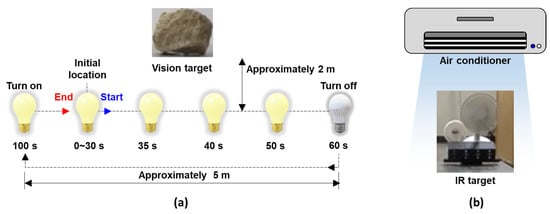 Simulation of (a) varying illumination and (b) varying temperature conditions in 24 h continuous displacement using the light source and air conditioner, respectively.