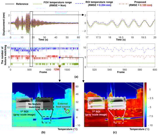 For the IR camera, a scale factor was estimated as 3.827 mm/pixel and the temperature range was optimized as [−10.2 , 6.4 ]. The displacements estimated using the ROI, FOV, and optimized temperature ranges are compared in Figure 20a. The optimized temperature range exhibited the best displacement estimation performance with an RMSE of only 0.189 mm. Figure 20a shows a comparison of the number of matched feature points. Although the ROI temperature range had the most matched feature points, many of these feature points were mismatched and the displacement estimation accuracy was worse than that obtained using the optimized temperature range. Only a few feature points were matched when using the FOV temperature range, and a matching failure occurred when using an external heat source (e.g., bus exhaust). Therefore, the displacement could not be continuously estimated. However, the use of the optimized temperature ensured sufficient correctly matched feature points with and without a heat source (Figure 20b,c).