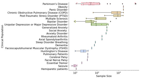 Sample sizes of clinical populations included in selected studies, with x-axis (sample size) presented on a logarithmic scale.