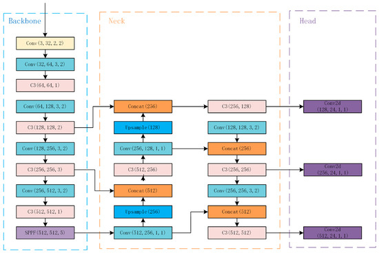 Figure 1 shows the original network of YOLOv5, the network structure of the backbone, which in the blue box includes the Conv layer, C3 layer, and SPPF layer. The Conv layer extracts feature maps through convolution operation, normalizes the distribution of eigenvalues, and introduces nonlinear transformation capability to realize the transformation and extraction of input features. The C3 layer improves the ability of feature extraction by increasing the depth of the network and the receptive field. The SPPF layer can convert feature maps of any size into fixed-size feature vectors. The neck network structure in the orange box includes the Conv layer, C3 layer, Concat layer, and Upsample layer. The Concat layer concatenates two or more feature maps in the channel dimension. The Upsample layer is to upsample the input feature map and expand the scale of the feature map. The head network structure, which is in the purple box, includes three Conv2d layers. The Conv2d layer only extracts features through convolution operation.