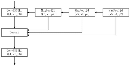 The architecture of the SPPF layer is connected by three max-pooling layers in sequence, which can reduce the computing cost, as shown in Figure 3. Moreover, SPPF can perform the same functions as SPP in half the time. The ConvBNSiLU layer plays the same role as the Conv layer in the backbone. It extracts feature maps through convolution operation, normalizes the distribution of eigenvalues, and introduces nonlinear transformation capability to realize the transformation and extraction of input features.