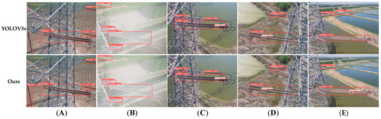 As shown in Figure 9, we compared the original YOLOv5s network and our network. In Figure 9A, YOLOv5s cannot detect the insulator in the corner of the image, but our proposed network can detect it correctly. In Figure 9B–D, we selected the pictures under foggy, sunny, and normal conditions. YOLOv5s network and our network can both correctly detect insulators and defects, but the accuracy of our network is much higher than the YOLOv5s network. In Figure 9E, the YOLOv5s network had a wrong detection of insulators, and it cannot detect the defect; our model can detect the insulators and defects with high accuracy. The comparison results show the superiority of our network.
