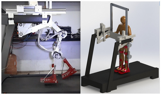 In recent years, rehabilitation systems have been developed in order to assist patients with their movements and restore their motor ability. Exoskeletons have contributed to patients’ health by helping them to carry out physiotherapeutic routines [1]. Among the tasks with which the exoskeletons assist, we can mention support for walking, for standing, and for the execution of specific therapy routines [2,3,4]. The exoskeletons for patients or elderly care are responsible for helping people with some type of weakness to carry out their daily tasks as in [5], in which the authors developed a lower limb exoskeleton with the purpose of assisting the sit-to-stand and stand-to-sit tasks for people with spinal cord injury or elderly people. In addition, exoskeletons applied to rehabilitation have become an important tool for therapists; they reduce the risks to their health caused by the transport of people [6]. There are various architectures that can be used for bilateral training; for lower limbs, mainly for adults, as in [7], where three healthy male subjects aged 27, 25 and 24, and three subjects undergoing stroke rehabilitation, two men and one woman aged 54, 68 and 30, were enrolled in experiments with walking rehabilitation exoskeletons. Some authors place great emphasis on the mechanical and electronic design of the exoskeleton as a fundamental part of its development, as in [8,9], where the authors present in detail the mechanical design of their exoskeletons.