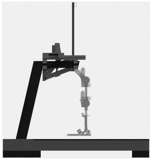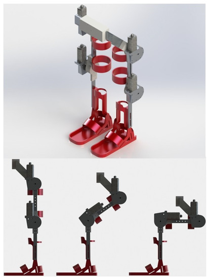 The lifting system of the exoskeleton is responsible for carrying the entire weight of the patient, from the sitting position to the standing position and for the entire rehabilitation session, leaving the rehabilitation task to the legs only. The exoskeleton lifting system is made up of a double four-bar system operated by two linear actuators, model LACT6P, which can withstand a load of 50 kg each, see Figure 3. It is anchored, at one end, to the hand supports of a standard treadmill and, at the other end, joins the mechanical legs, allowing them to go up and down while always maintaining its vertical.