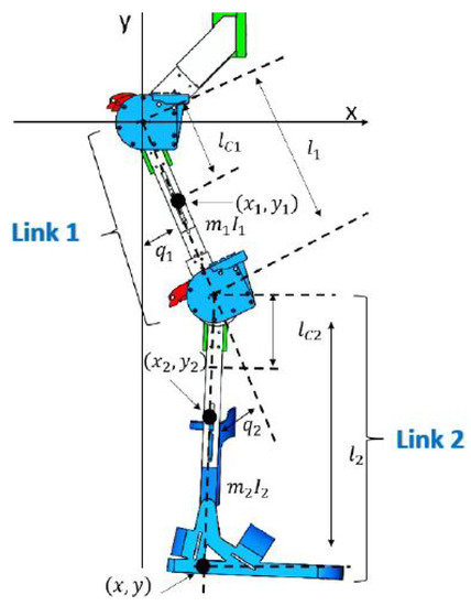 Initially, the dynamical model of the exoskeleton was obtained by considering the simplified model with rigid joints as shown in Figure 4, in which there were two links corresponding to the thigh (link 1) and the leg (link 2) with lengths and , and with masses and , respectively.