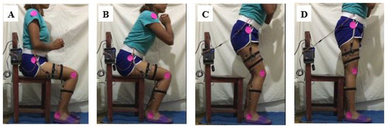 The motion trajectories of each joint were obtained by video analysis of the three movement routines: sitting to standing (STS), standing to sitting (STA), and standing to walking (SW). Markers were placed on the joints to obtain the angular positions. Figure 6 shows the images of the four phases of the cycle from sitting to standing (A-Start, B-Incline, C-Elevation and D-Stabilization) and their respective markers. The angular positions were obtained with respect to the hip and the flexion and extension values were obtained using the coordinates of the markers.