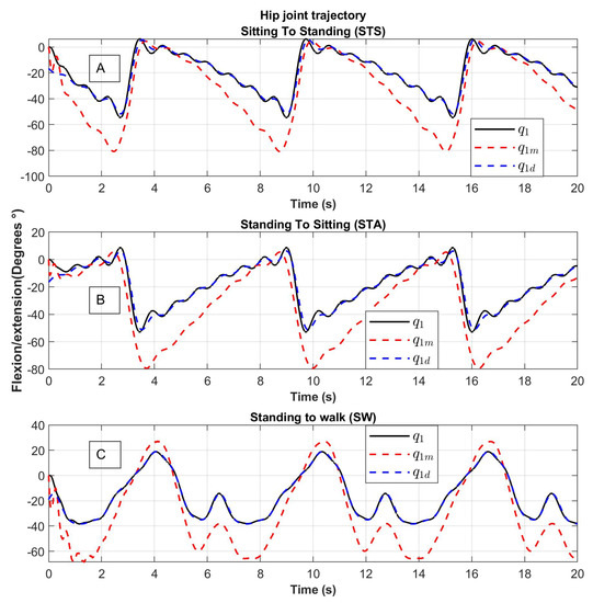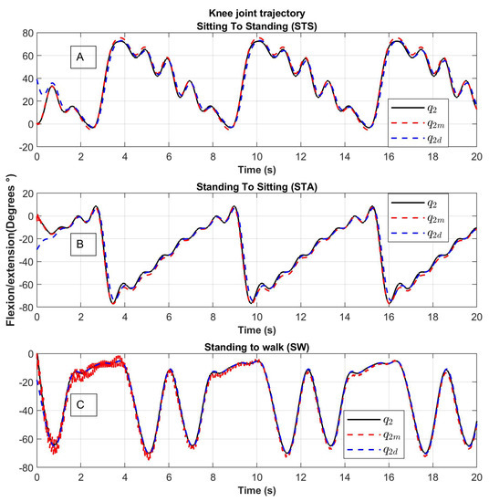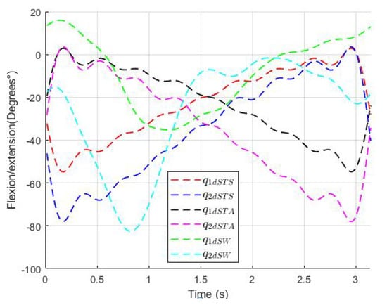 The angular trajectories obtained for the routines sitting to standing, standing to sitting, and standing to walking, denoted by ∈ , ∈ , and ∈ , respectively, can be found below. A period is considered so that for (the period can be chosen appropriately) and the order of the polynomial is chosen as . Figure 7 shows the desired trajectories obtained from Equations (7)–(12) which are smooth and bounded since the positions and velocities are bounded. The upper bounds are shown in Table 2.