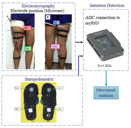 A motion intention detection system was obtained using electromyography sensors and ground reaction force sensors that operate as a baropodometry sensor. Four muscles were established whose signals are read by the detection system: the Biceps Femoris (BF), the Rectus Femoris (RF), the Tibialis Anterior (TA) and the Gastrocnemius (GAS).