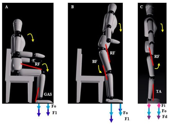 In the initial movement of sitting on a chair, with respect to the muscles, to flex the hip the rectus femoris contracts and to flex the knee the biceps femoris contracts. With respect to the ground reaction force, the initial value increases at the back of both feet and at the bottom of both feet the force decreases, being the sum equal to the initial reaction force , which can be seen in Figure 9B.