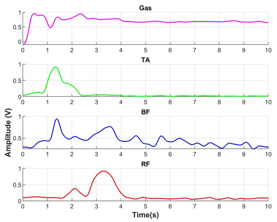 Electromyographic signals obtained from the movement from sitting to standing, Rectus femoris (RF) in red, Biceps Femoral (BF) in color blue, Tibial anterior (TA) in green, and Gastrocnemius (Gas) in pink.