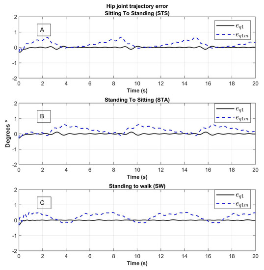 Hip joint tracking error of movement from (A) Sitting to Standing (STS), (B) Standing to Sitting (STA) and (C) Standing to Walking (SW); : error of the trajectory of the link, : error of the trajectory of the motor.