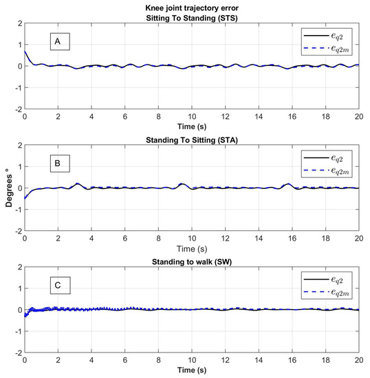 Knee joint tracking error of movement from (A) Sitting to Standing (STS), (B) Standing to Sitting (STA) and (C) Standing to Walking (SW); : error of the trajectory of the link, : error of the trajectory of the motor.