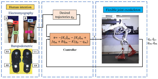 The paper is organized as follows. In Section 2, the design and mechanical development of the platform is presented. In Section 3, the development of the exoskeleton dynamical model with elastic joints and the obtaining trajectories of motion are presented. The electromyography and baropodometry sensors are described in Section 4. The design and development of the control law are presented in Section 5. The numerical results and real-time experimental results are presented in Section 6. Finally, the conclusions are presented in Section 7.