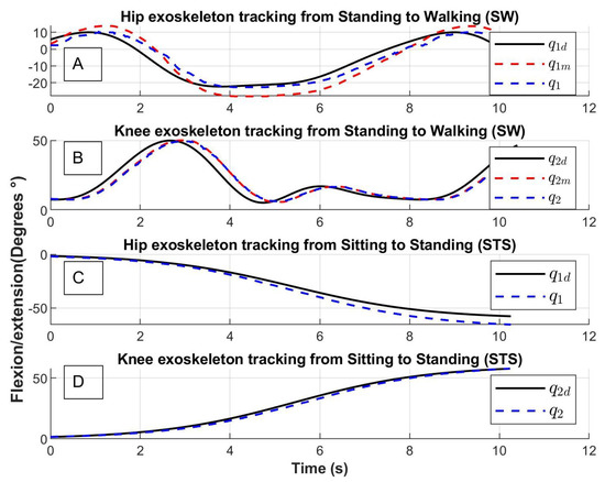Exoskeleton tracking trajectory of (A) Hip from Standing to Walking (SW), (B) Knee from Standing to Walking (SW), (C) Hip from Sitting to Standing (STS) and (D) Knee from Sitting to Standing (STS); : the trajectory of the link, : desired trajectory, : the trajectory of the motor with .