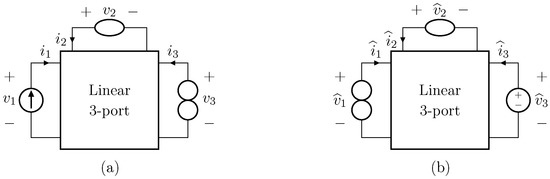 In Equation (2), and are the voltage and current at port x of the network shown in Figure 2a. We can repeat the same procedure for the circuit shown in Figure 2b yielding