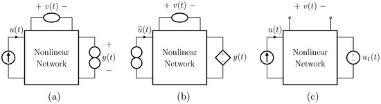 where U and are the sets of input signals u and that are admissible for the considered application. Note that, for the sake of clarity, here and in the following, we omit the dependence on the continuous-time variable t. If we re-introduce the nullator, we constrain voltage v to be zero leading the system into an unphysical condition. In order to avoid such an unphysical state, one of the two sources u and must be substituted with a norator. This will in turn assume voltage and current values such that the system of Equation (8) presents real solutions. It follows that two possible circuits can be derived, namely, the circuits in Figure 3a,b. Given that these two systems are characterized by the same topology, we can write for the circuit shown in Figure 3a