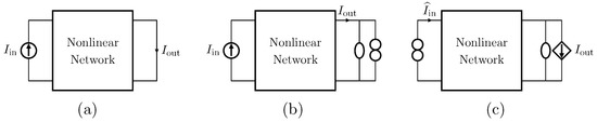 Let us consider a nonlinear non-autonomous circuit containing at least one nullor, as the one shown in Figure 3a. Let us also consider the circuit shown in Figure 3b, where the input generator is replaced by a norator, and the norator by a proper controlled source. If for any input signal and , where t is the continuous-time variable in seconds, such systems have unique bounded solutions, and if, defined the state vectors of the two systems as and , the equation holds true, then the circuit in Figure 3b is the inverse of the circuit in Figure 3a.