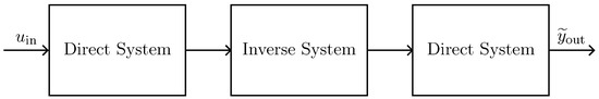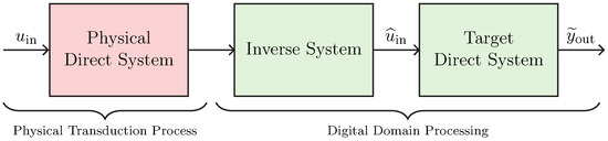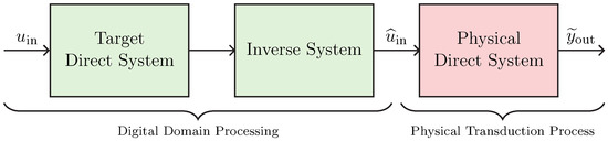 We now present a general block chain to perform virtualization of transducers. Such a chain, shown in Figure 7, is called Direct–Inverse–Direct Chain (DIDC) and was proposed in [17] for addressing the virtualization of loudspeakers. It is composed of three main blocks: two Direct Systems, and one Inverse System. The Inverse System is always implemented in the digital domain, whereas, according to the considered actuator or sensor application, only the first or the last Direct System is implemented in the digital domain since the other is the actual physical transducer. Moreover, in real scenarios, amplifiers could be present in-between blocks. Hence, gains should be considered at different stages of the processing chain for the algorithm to properly work.