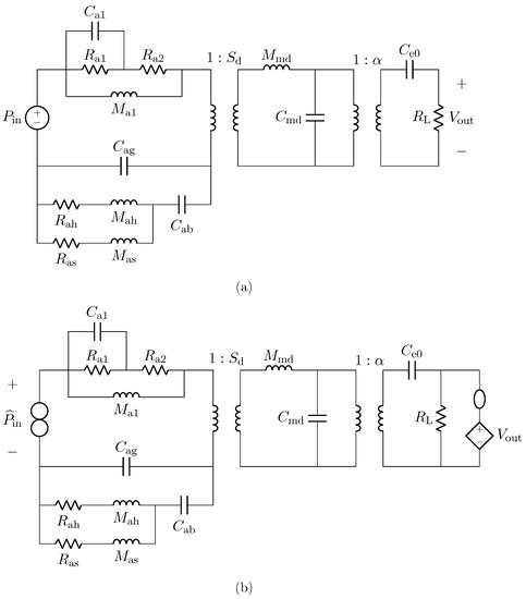 Circuital model of the capacitive microphone. (a) Direct System; (b) Inverse System.