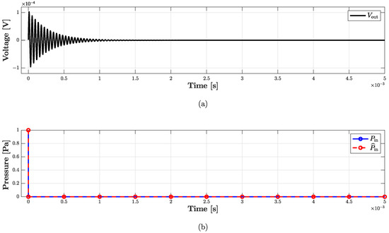 In this subsection, we refer to the digital implementation of the microphone BK4134 equivalent circuit as Direct System. By applying the theorem presented in Section 2, it is possible to derive the Inverse System circuit shown in Figure 10b. In particular, since we are in a VIVO scenario, in order to design the Inverse System, once augmented the Direct System with a parallel connection of a nullator and a norator as explained in Section 2.2.1, we substitute the norator with a VCVS driven by and the input source with the norator. The Inverse System can be implemented in the WD domain in a fully explicit fashion. In order to validate the Inverse System implementation, we consider the processing chain in Figure 13 which is composed of the cascade of the Direct System and the Inverse System, and we verify that the output of the cascade is equal to the input of the same cascade, i.e., . Figure 14 shows the results of such a test. We consider the input signal of the Direct System to be an impulse and we compute the response of the microphone, which is shown in Figure 14a. Then, we feed the BK4134 Inverse System with the obtained voltage signal and we compare the output with the input . Looking at Figure 14b, we can notice that and match perfectly since the output of the Inverse System is indeed an impulse. In order to further remark the accuracy of the Inverse System implementation, we compute the Root Mean Square Error (RMSE) between the input and output of the processing chain, obtaining a result below the machine precision. Finally, a similar test is carried considering the circuit equivalent parameters of microphone BK4146; even in this case, the RMSE is numerically zero.