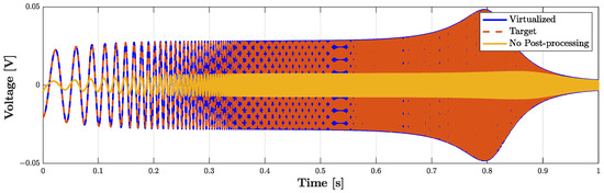PITC-based virtualization algorithm. Output voltage signals of: the Direct System, i.e., BK4134, when no virtualization algorithm is present (“No Post-processing”), the Target Direct System, i.e., BK4146 (“Target”), and the PITC (“Virtualized”).