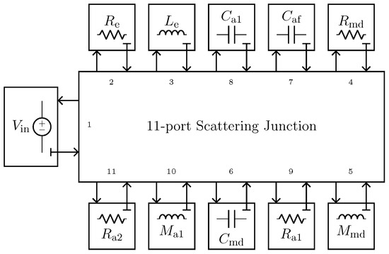 The implementation of the microphone circuital model in the digital domain can be carried out by employing different techniques [21,36,37]. In this work, we use Wave Digital Filters (WDFs) [21] since they proved to be suitable for an efficient implementation of both direct and inverse models of loudspeakers [16,17]. In particular, elements and topological interconnections can be realized as explained in [24], whereas nullors are encompassed into the scattering junction exploiting the double digraph decomposition of connection networks presented in [23]. Then, being the circuit linear, the Wave Digital (WD) structure can be solved with no iterative solvers by means of traditional techniques [21]. A possible WD realization of the circuit in Figure 10a is shown in Figure 11.