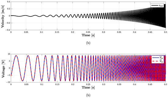 Validation of the Inverse System. (a) Input voltage of the Direct System; (a) output velocity (i.e., a current) of the Direct System; (c) output voltage of the Inverse System.