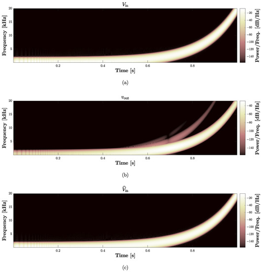 where V is the amplitude, while all the other parameters are set as in Section 4.2. Figure 19 shows the signals obtained in the first s of simulation: the dashed red curve represents the input of the Direct System, i.e., , and is perfectly overlapped with the continuous blue curve which represents the output of the Inverse System, i.e., . To further analyze the performance of the Inverse System, in Figure 20 we also provide the spectrograms of the three signals involved in the validation chain. In particular, Figure 20a shows the spectrogram of , Figure 20b the spectrogram of , while Figure 20c the spectrogram of . In the second plot, we can appreciate the nonlinear behavior of the loudspeaker circuital model since different harmonics appear over the frequency spectrum. Looking at the third plot, instead, we can further verify the action of the Inverse System since the harmonics characterizing (i.e., the input of the Inverse System) nicely disappear, leading to a perfect match between and . Finally, both for time- and frequency-domain studies, we compute the RMSE between and obtaining, once again, values below machine precision.