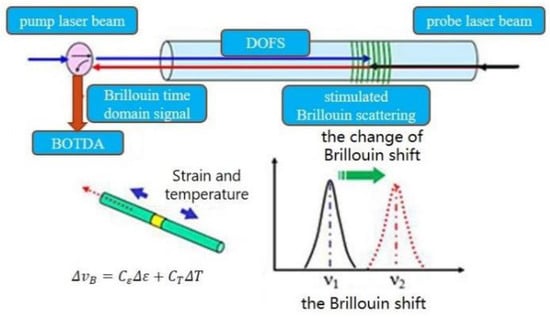 The DOFS is demodulated by Brillouin optical time domain analysis (BOTDA), which is based on optical time domain reflectometry (OTDR) and stimulated Brillouin scattering (SBS). As shown in Figure 1, the pulsed light and continuous light are injected into the sensing fiber from both ends. The continuous light frequency is tuned, and the Brillouin scattering in the opposite direction will be generated when the frequency difference between the two laser beams is equal to the Brillouin frequency shift. Researchers have shown that the Brillouin shift is linearly dependent on the strain and temperature. The changes in strain and temperature along the optical fiber can be calculated by Equation (1) when the Brillouin frequency shift is obtained using BOTDA [].
