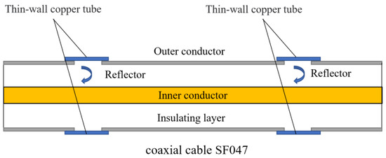 The fabrication process of the CCFPI sensor was as follows: (1) A section of SF047 coaxial cable was intercepted, and the positions of two reflectors were marked 20 cm apart; (2) peel off the outer conductor 6 mm at the marked position; (3) the thin-walled copper pipe with an inner diameter of 1.3 mm, a thickness of 0.1 mm and a length of 10 mm is set at the position of the reflector, then the copper pipe and the outer conductor are welded as one with solder paste.