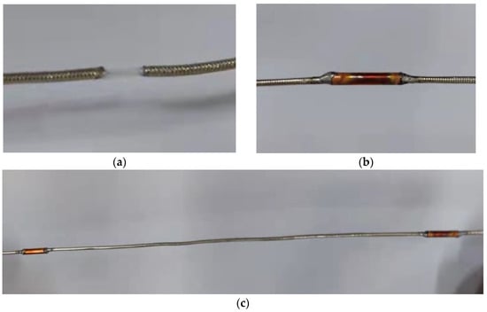 Fabrication process of the CCFPI sensor. (a) Peel off the outer conductor; (b) sweat the copper tubing; (c) the completed CCFPI sensor.