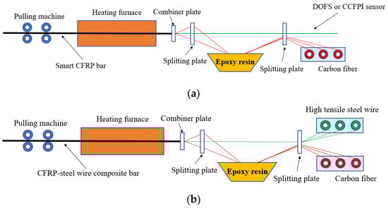 Fabrication process of CFRP bars. (a) Smart CFRP bar; (b) CFRP-steel wire composite bar.