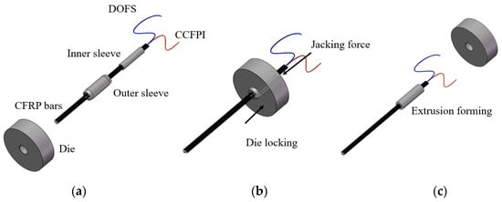 The proposed OECS-CFRP cable in this paper is assembled by three CFRP-steel wire composite bars, one CFRP-DOFS bar, and one CFRP-CCFPI bar through the anchoring system, as shown in Figure 7. The anchoring system is developed on the basis of the single CFRP bar anchoring system in Reference [], which is designed to grip the CFRP bar through radial contact pressure generated by the extrusion process of the metal sleeve. The anchoring system consists of an aluminum inner sleeve and a steel outer sleeve. The inner sleeve has five holes with a diameter of 5.2 mm distributed in the shape of a plum blossom, and the five CFRP bars are passed through the holes, respectively. The CFRP-DOFS bar and the CFRP-CCFPI bar pass through non-adjacent holes. The inner surface of the outer sleeve and the outer surface of the inner sleeve have exactly the same contour so that they can fit closely. As shown in Figure 7a, the CFRP bars, inner sleeve, outer sleeve, and die are put in order before extrusion. During extrusion, the CFRP bars, inner sleeve, and outer sleeve are pushed to go through the die by the extruding machine. In this process, the elastic deformation of CFRP bars and the plastic deformation of metal sleeves occurs. After extrusion, the elastic deformation recovery of CFRP bars is limited by the metal sleeves, which produces radial pressure to grip the CFRP bars tightly. The other end of the CFRP bars is then anchored together in the same way.