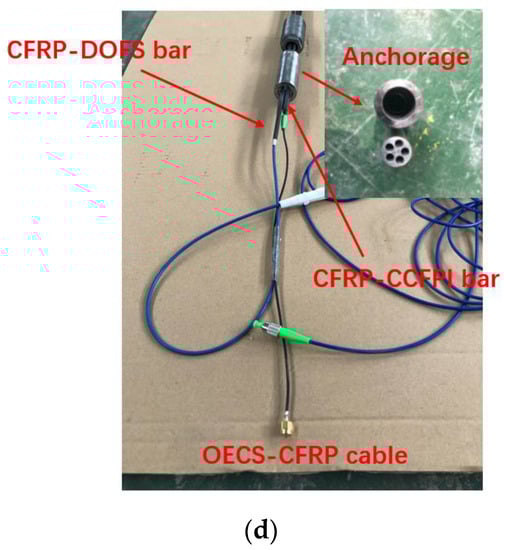 Given the analysis above, an optical–electrical co-sensing CFRP cable (OECS-CFRP cable) was designed and manufactured in this paper. It consists of a new anchorage system and five CFRP bars, including three CFRP-steel wire composite bars, one CFRP-DOFS bar, and one CFRP-CCFPI bar. The new anchorage system is similar to that proposed in Reference [], except that five CFRP bars can be anchored simultaneously instead of a single rod. The developed OECS-CFRP cable can not only measure the strain of CFRP cable in the normal use stage with high precision but also measure the large deformation of CFRP cable in the load-bearing capacity reduction phase with relatively low precision. Firstly, a brief description is outlined for the production technology of the CFRP-DOFS bar, CFRP-CCFPI bar, and CFRP cable anchorage technology. Subsequently, the sensing and mechanical properties of the OECS-CFRP cable were characterized by serious experiments. Finally, the OECS-CFRP cable was used for the prestress monitoring of an unbonded prestressed RC beam to verify the feasibility of the actual structures.