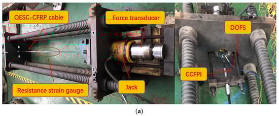 The prestress of the OECS-CFRP cable was applied through a reaction device, as shown in Figure 15. In order to coordinate the strain of CFRP bars in the CFRP cable, pre-tension was required before formal tension, and the pre-tension force was 10 kN. After pre-tension, the strain of each CFRP bar was measured by DOFS, CCFPI, and strain gauges. The limiting bolts on the steel plate were adjusted so that the strain difference between any two CFRP bars was within 10%.