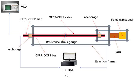 For the sensors, two 2.6 m long OECS-CFRP cables named C1 and C2 with DOFS and CCFPI sensors were prepared, and the experimental setup is shown in Figure 8. The spatial resolution of DOFS and the gauge length of the CCFPI sensor were both 20 cm. An electric resistance strain gage was attached longitudinally to the middle of the CFRP-DOFS bar and the CFRP-CCFPI bar, respectively, whose measurements are used to calibrate the strain sensitivity of the CFRP-DOFS bar and the CFRP-CCFPI bar.