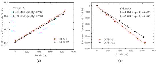 Strain–frequency shift curve of CFRP smart bars. (a) DOFS; (b) CCFPI.