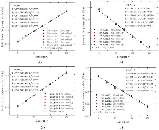 The tension–frequency shift curves in Figure 10 show the linear relation between the tension and frequency shift of DOFS and CCFPI in the OECS-CFRP cables. As shown in Figure 10a,c, the tension sensitivities of DOFS in specimen C1 vary from 2872.7 to 2897.5 kHz/kN, and the average value is 2880.6 kHz/kN. In specimen C2, they vary from 2762.4 to 2803.7 kHz/kN, and the average value is 2781.0 kHz/kN. It can be seen that the Brillouin frequency shift curves have good consistency, linearity, and no obvious lag.