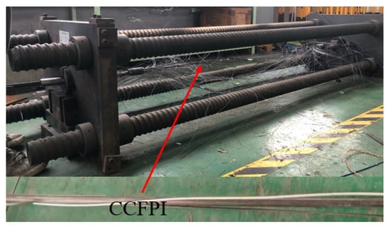 The load is applied in a step of 25 kN at the beginning of loading and reduced to 5 kN when the tension is greater than 150 kN. The tension of the cable and the strain of the CFRP bars were recorded for each load step or when the cable reached the ultimate tension. The failure of the CFRP cable after reaching the ultimate tension is shown in Figure 11. As can be seen from the figure, the CCFPI sensor is still intact after the CFRP-CCFPI bar splits.