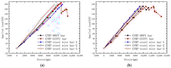 The tensile damage test of the OECS-CFRP cable was carried out by using the same experimental setup as that of the sensing performance test in Figure 8. A difference from the sensing performance test is that an electric resistance strain gauge was attached longitudinally to the middle of the three CFRP-steel wire composite bars, respectively, instead of the smart CFRP bars. The strain of three CFRP-steel wire composite bars was obtained through electric resistance strain gages; that of the CFRP-DOFS bar and CFRP-CCFPI bar were measured by DOFS and CCFPI sensors, respectively.