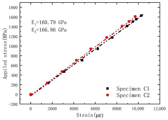 The average strain of five CFRP bars is taken as the strain of CFRP cable, and the ratio of tension of CFRP cable to the total section area of CFRP bars is taken as the stress of the CFRP cable. Figure 13 shows the stress–strain relationship of the OECS-CFRP cable. The elastic modulus of sample C1 and sample C2 are 160.79 GPa and 166.86 GPa, respectively. Taking the average of the measured results of two samples, the elastic modulus of the OECS-CFRP cable is 163.83 GPa and the ultimate strength is 1676 MPa, as shown in Table 2.