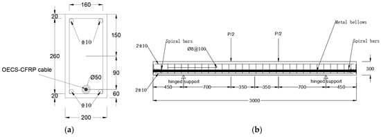 An unbonded prestressed RC beam of a cross-section of 200 mm × 300 mm and a span of 3000 mm was tested in this research. Figure 14a is the section size and reinforcement diagram of the test beam. Then, four HRB400 steel reinforcements with a diameter of 10 mm were arranged in the compression zone and tension zone of the section. A metallic bellow with a diameter of 50 mm was embedded in RC beams to serve as the prestressed channel. In order to eliminate the stress concentration of the beam, steel plates of 20 mm thickness, 120 mm × 120 mm section and spiral bars of a diameter of 8 mm, spiral inner distance of 110 mm, and five hoops were embedded in the tension and anchorage area of the beam. The mechanical properties of concrete and steel reinforcement are shown in Table 4 and Table 5.